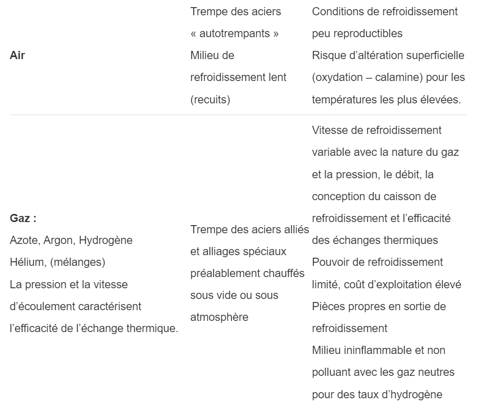 Le milieu de trempe (incluant les effets des propriétés du fluide et de l’installation de trempe) est caractérisé par différents critères